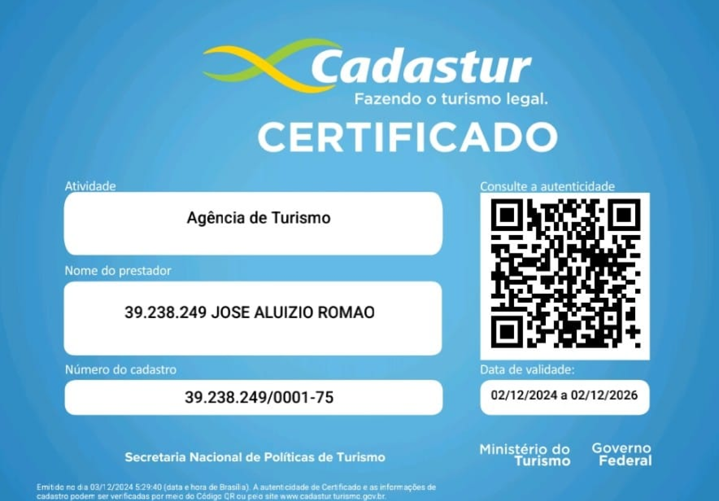 Ao escolher nossos serviços, você conta com um motorista devidamente certificado pelo Cadastur, o registro oficial do Ministério do Turismo. Essa certificação é uma garantia de que atendemos aos mais altos padrões de qualidade, profissionalismo e segurança exigidos para serviços turísticos no Brasil.